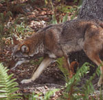Le loup rouge doit son nom à son pelage brun-rouge qui permet de le distinguer de l'autre espèce, le loup gris, qui est plus grand. Il pèse entre 23 et 32 kg et mesure de 51 à 81 cm au garrot. Il porte des oreilles plus grandes et plus proches que ceux des sous espèces qui vivent dans des climats plus chauds. Il est plus petit, plus léger et a des pattes plus fines que le Loup gris. Il préfère les terres marécageuses, les forets de pins à longues épines et les prairies brousailleuses. Le Canis Rufus a developpé une aptitude particulière : il peut se dresser sur ses maigres pattes postérieures afin de scruter les prairies et les marécages à la recherche de lapins et de rats. |