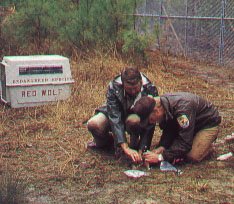 La forte densité de population de cervidés fournit aux loups une nourriture abondante qui améliore leurs chances de survie. Le projet est un succès et l'on estime qu'en 1996 de cinquante-cinq à soixante-quinze loups rouges vivaient à l'état sauvage. Les ancêtres du loup rouge vivaient autrefois jusque dans l'Illinois, au Nord, et jusqu'au Texas, à l'Ouest. Leurs effectifs déclinèrent, les loups se trouvant décimés par l'homme, et l'on se demande encore s'ils ne furent pas contraints de se croiser avec les coyotes pour survivre, créant ainsi un hybride. À la suite de plusieurs tests d'ADN effectués en 1991, l'Office américain de la pêche et de la nature concluait que le loup rouge n'est pas un hybride, mais certains contestent ces résultats. L'espèce était mal connue jusqu'à la mise en oeuvre du projet de sauvetage qui permit d'élever des loups, de les munir de colliers radioémetteurs et de les relâcher dans la nature. Au fur et à mesure de l'expansion des populations de loup rouge, les propriétaires des terrains deviendront les partenaires obligés du programme de sauvetage. Il faut en effet que les loups puissent continuer d'emprunter des corridors de contact entre populations afin de maintenir une diversité génétique aussi grande que possible. La réussite du projet dépendra peut-être plus du degré de tolérance que les hommes manifesteront vis-à-vis du loup que des moeurs de l'animal lui-même. |